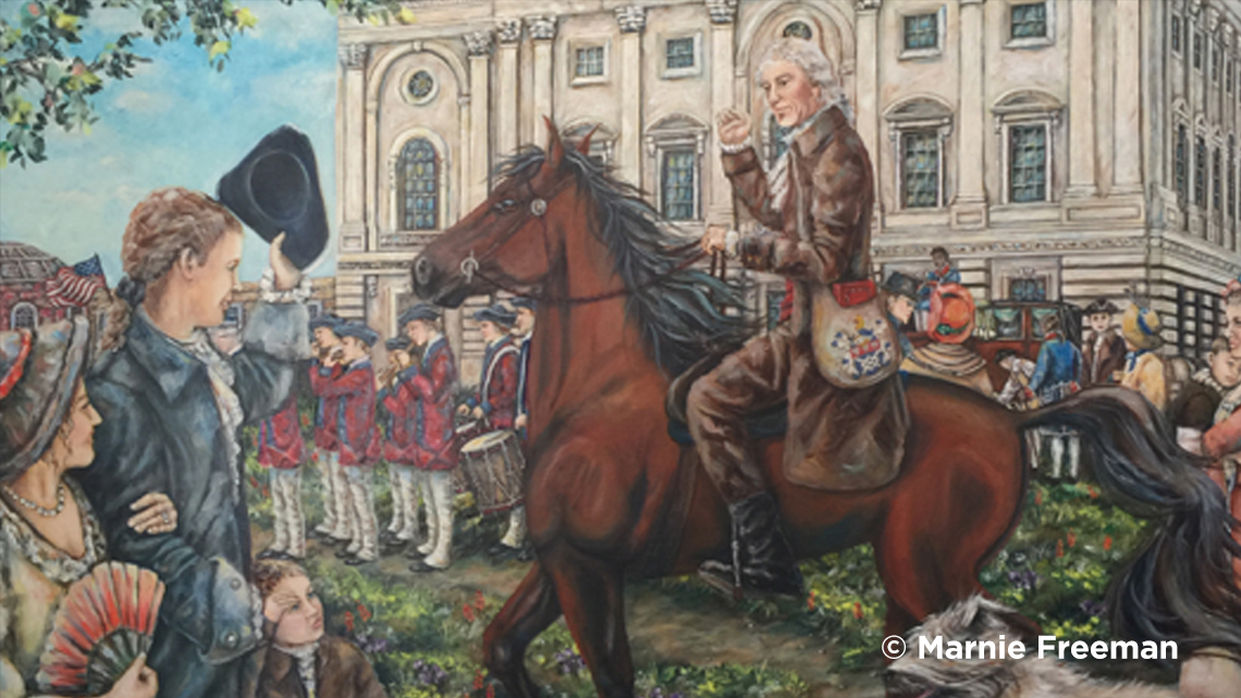The painting includes many historically accurate features. Research was supported by conversations and interviews with David Barton, the Architect of the Capitol, and Bill Federer. For example, President Jefferson is shown riding a bay horse, his favorite. Also, in the upper left corner, a mockingbird is depicted representing one of Jefferson’s many pets. His favorite was named “Dick." There is also a Briard dog, representing the breed Jefferson imported to work at Monticello with his sheep. Also shown (to the left of the Capitol building) is “the Oven,” a brick structure that served as a temporary chamber for the House of Representatives during Jefferson’s Presidency. The Jefferson Coat of Arms is depicted on his saddlebag as well as a red book of Common Prayer and one of his coaches.