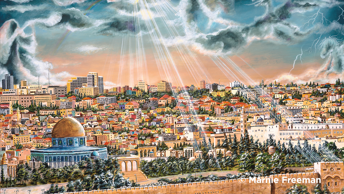 This is a very special painting that shows the Holy City from the view of the Mount of Olives with the Eastern Gate and Temple Mount site prominent. In the clouds and sky, you will discover hidden symbolism, representing the spiritual battles facing Jerusalem.